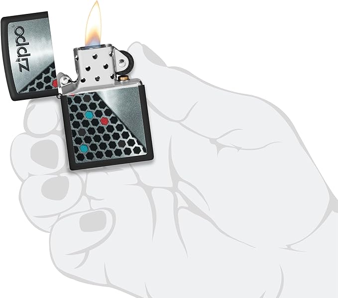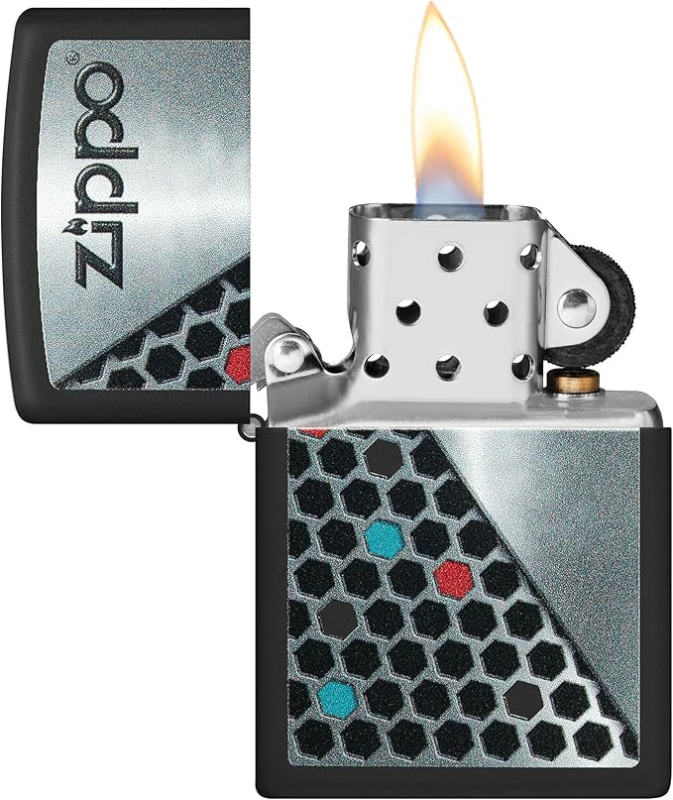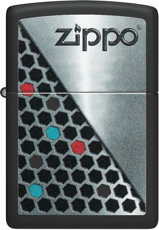 Корпус оформлен в контрастной цветовой гамме с диагональной композицией, в которой сочетаются фирменный логотип Zippo и узор из шестиугольников. Геометрический рисунок создаёт ощущение ритма и движения, а цветные акценты добавляют глубину и визуальный интерес, не перегружая общий образ. Чёткие линии и сбалансированное распределение элементов придают дизайну современный и уверенный характер, делая зажигалку выразительным, но универсальным аксессуаром.