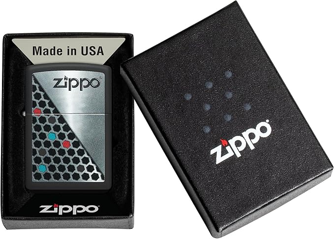 Корпус оформлен в контрастной цветовой гамме с диагональной композицией, в которой сочетаются фирменный логотип Zippo и узор из шестиугольников. Геометрический рисунок создаёт ощущение ритма и движения, а цветные акценты добавляют глубину и визуальный интерес, не перегружая общий образ. Чёткие линии и сбалансированное распределение элементов придают дизайну современный и уверенный характер, делая зажигалку выразительным, но универсальным аксессуаром.