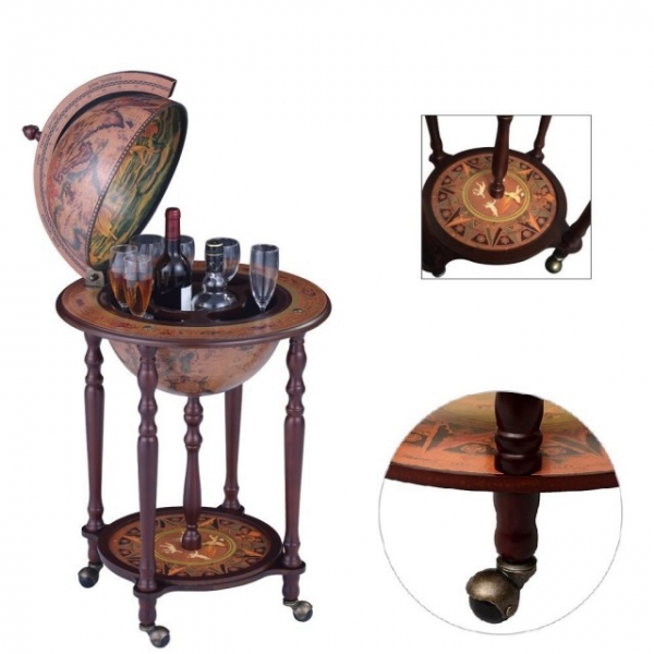 Сфера глобуса предназначена для хранения напитков и бокалов. Ножки глобуса снабжены роликами для того чтобы без труда передвигать наполненный бар. Рисунок на глобусе предоставляет стилизацию карт XVI-XVII веков.